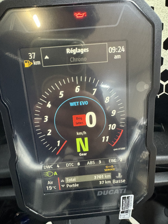 _Options : ABS, Traction control, Modes de conduite, Régulateur de vitesse, Ducati Multimedia System, Régulateur de vitesse, Feu additionnel Denali, Poignées chauffantes, Crashbars, Sabot moteur, Protèges-mains, Echappement Termignoni